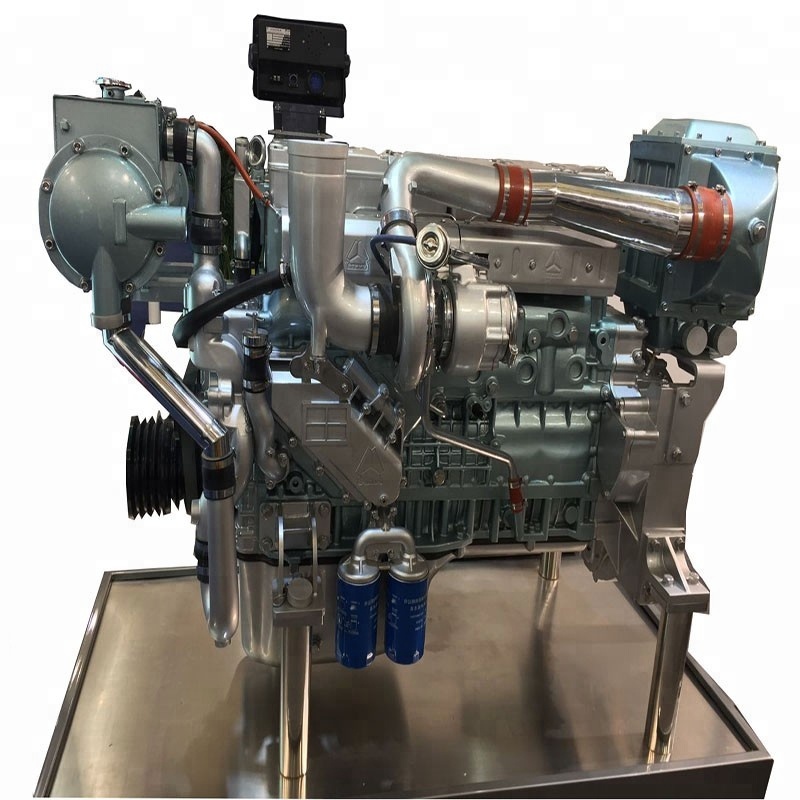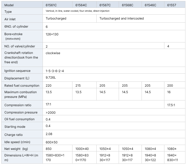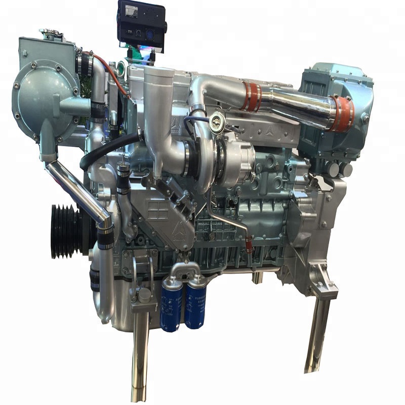 Sinotruk marine engine devided into for series, that is WD615, WD415, WD615.57, and D12 series for main power engines and auxiliaries. 1. Main power engines are devided into two categories, basic use and fishing boat use with speed 1500r/min,1800r/min,2100r/min(or 2000r/min). The basic includes turbocharged intercooled engine model and turbocharged model, and the turbocharged intercooled models are the same as truck engines, but adding marine special spares, such as marine intercooler, sea-fresh water heat-exchanger, monitor, PS8500 fuel injection pump(with parking electromagnet),sea water pump, SAE1# flywheel case, 14'flywheel, and flywheel connecting flange, supporter, the installment size is 740*1089.2(and for WD415 series is 740*789.2), the distance from crankshaft center height is 135. The fishing boat used engines based on the basic used have been changed into 4 slots fishing pulley, connecting flange(M14*1.5), diesle filter installed in the air-intake pipe and also add diesle pre-filter installed in the air-intake pipe, the installing size is 694*1145.5*140mm( for WD415series is 694*805.5*140mm). Main power engines can choose 6135flywheel case, when replace with SAE1 flywheel case, please change the flywheel case and connecting flange.
