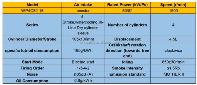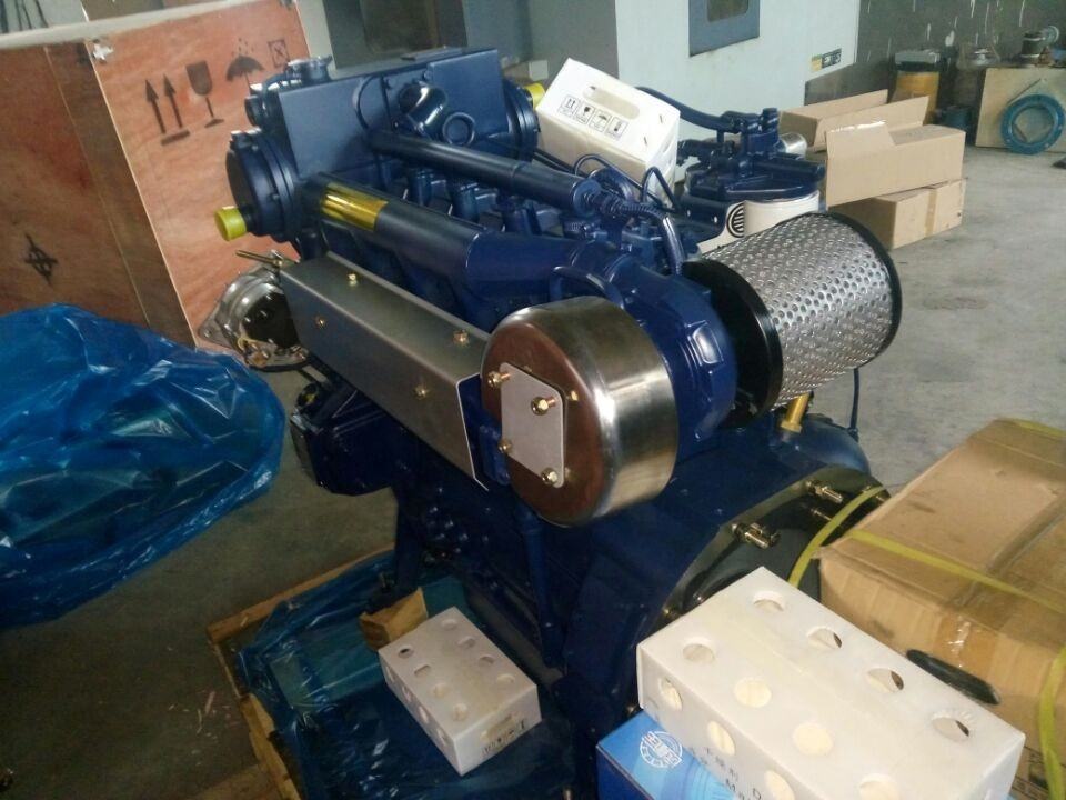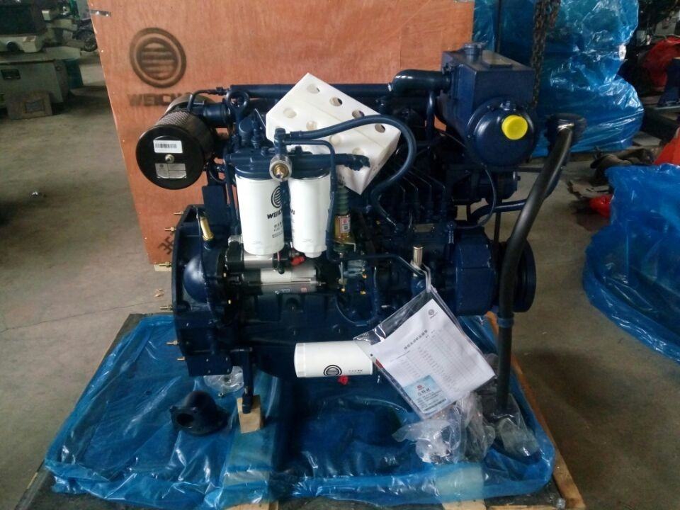 Weichai WP4 marine diesel engine series is the variation developed in accordance with laws and regulations based on marine engine working conditions and modification of engine combustion system, intake and exhaust system, cooling system, power output system and engine monitoring system. The engine has wide power and speed range, small size,light weight, compact structure, reliable work, advanced parameters and easy installation.